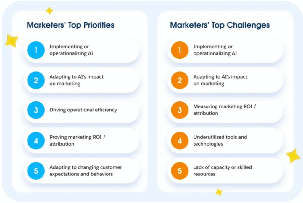 This alignment is structural. More than half of marketers say their top KPIs now directly tie to revenue growth and pipeline contribution, rather than engagement metrics alone. At the same time, 60% cite improving customer journey orchestration across marketing, sales, and service as a top priority, highlighting the need for end-to-end visibility.
